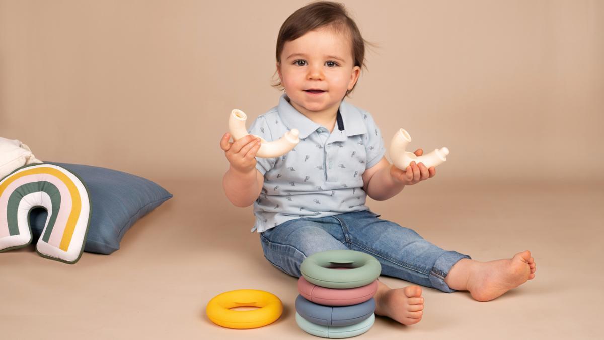 Das bunte Spielzeug lädt zum munteren Stapeln, Bauen und Stecken ein und vereint sämtliche Merkmale, die Spielzeug für Kleinkinder pädagogisch wertvoll machen, in sich.