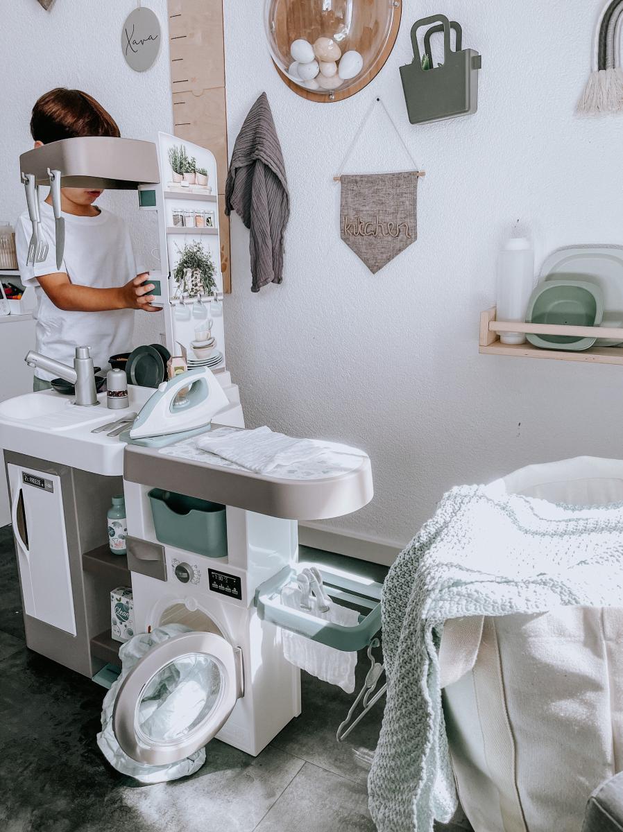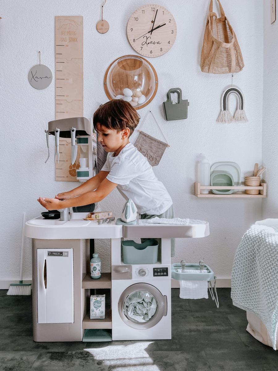 Un bouton avec fonction krick-krack permet de sélectionner les différents programmes et à la machine de commencer son travail. Le séchoir à linge, qui fait partie des accessoires de cuisine pour enfants ainsi qu'un petit panier à linge et un fer à repasser permettent de préparer le linge dans l'armoire. Le fer à repasser fonctionne mécaniquement et le petit panier à linge avec deux poignées peut être rangé sous la planche à repasser disponible. Une cuisine pour enfants qui répond à tous les souhaits.