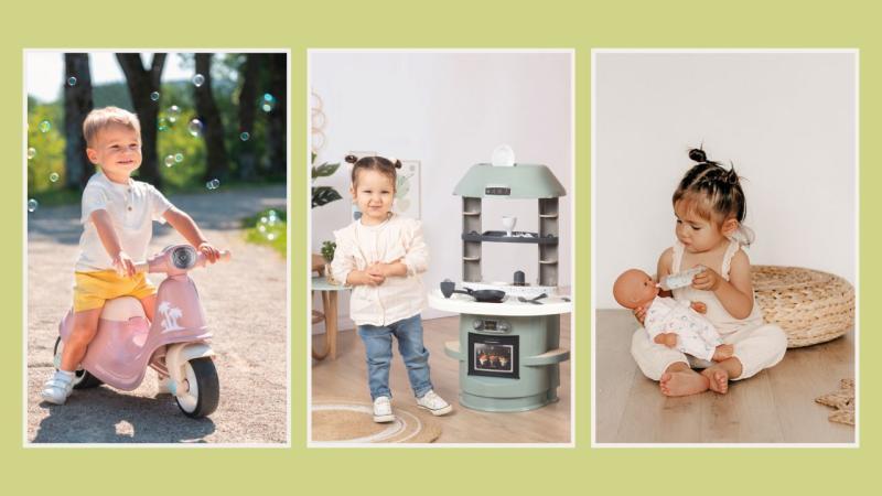 Les cadeaux idéaux pour les tout-petits encouragent le mouvement, la parole et l'imagination - par exemple des vélos d'équilibre, des jouets éducatifs, des poupées ou des jouets d'extérieur tels qu'un petit toboggan ou un bac à sable de Smoby.